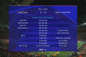 betvictor伟德官网-全场跑动数据:阿森纳平均比皇马多1km,前4都是枪手球员